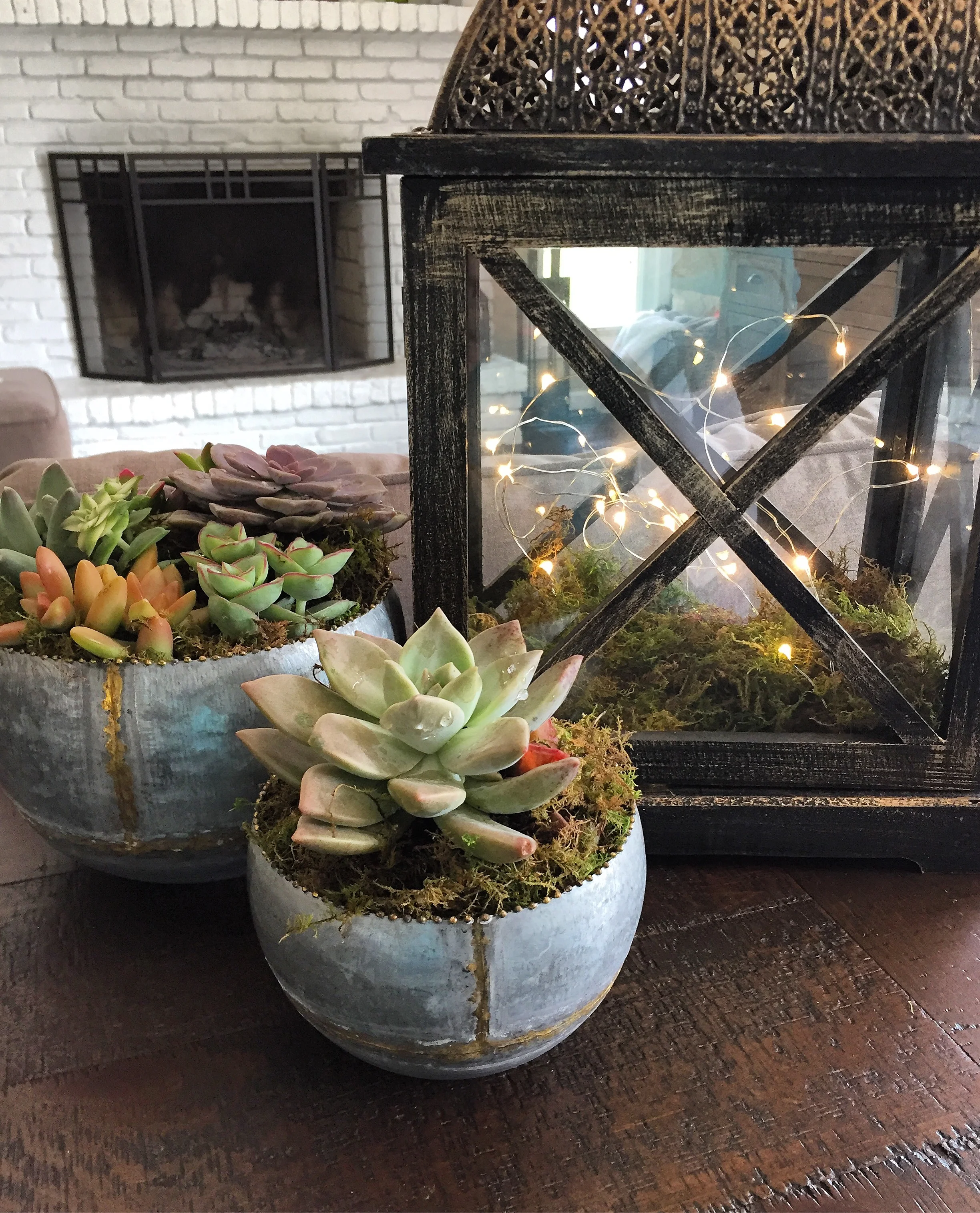And did I mention succulents are super easy to care for? You only need to water them once a week so they are perfect for people (like me) who have a hard time keeping houseplants alive. You can also use small rocks to cover the dirt and any bare spots as well. Happy planting!