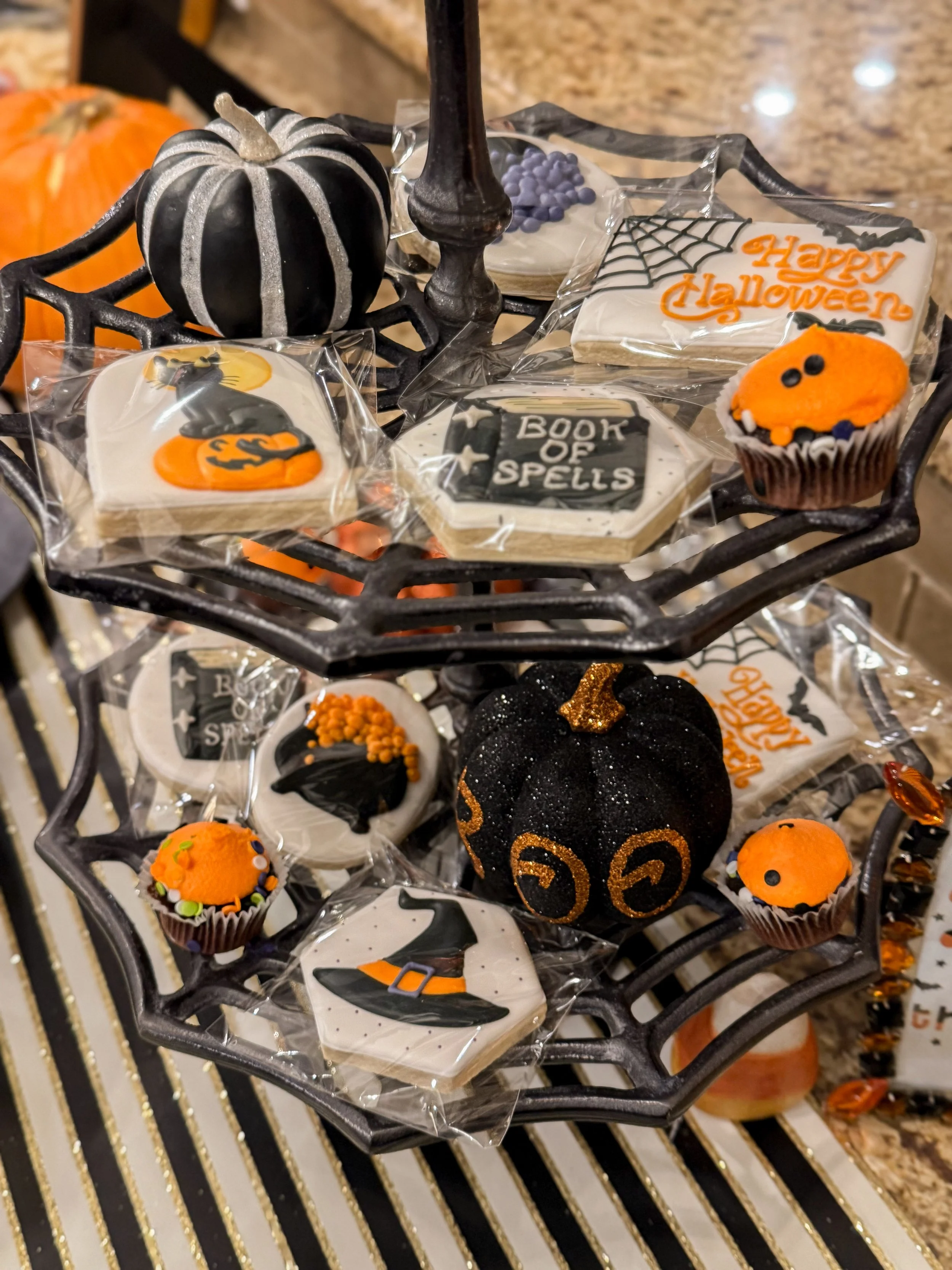 For food, we had jack-o-lantern shaped pepperoni pizzas, a fun charBOOterie board with plenty of halloween themed sweet treats, chips and dips, a yummy pumpkin roll, “witch finger” pretzel rods, and witchy themed sugar cookies! And of course plenty of wine including fun witch themed wines with fall spices!